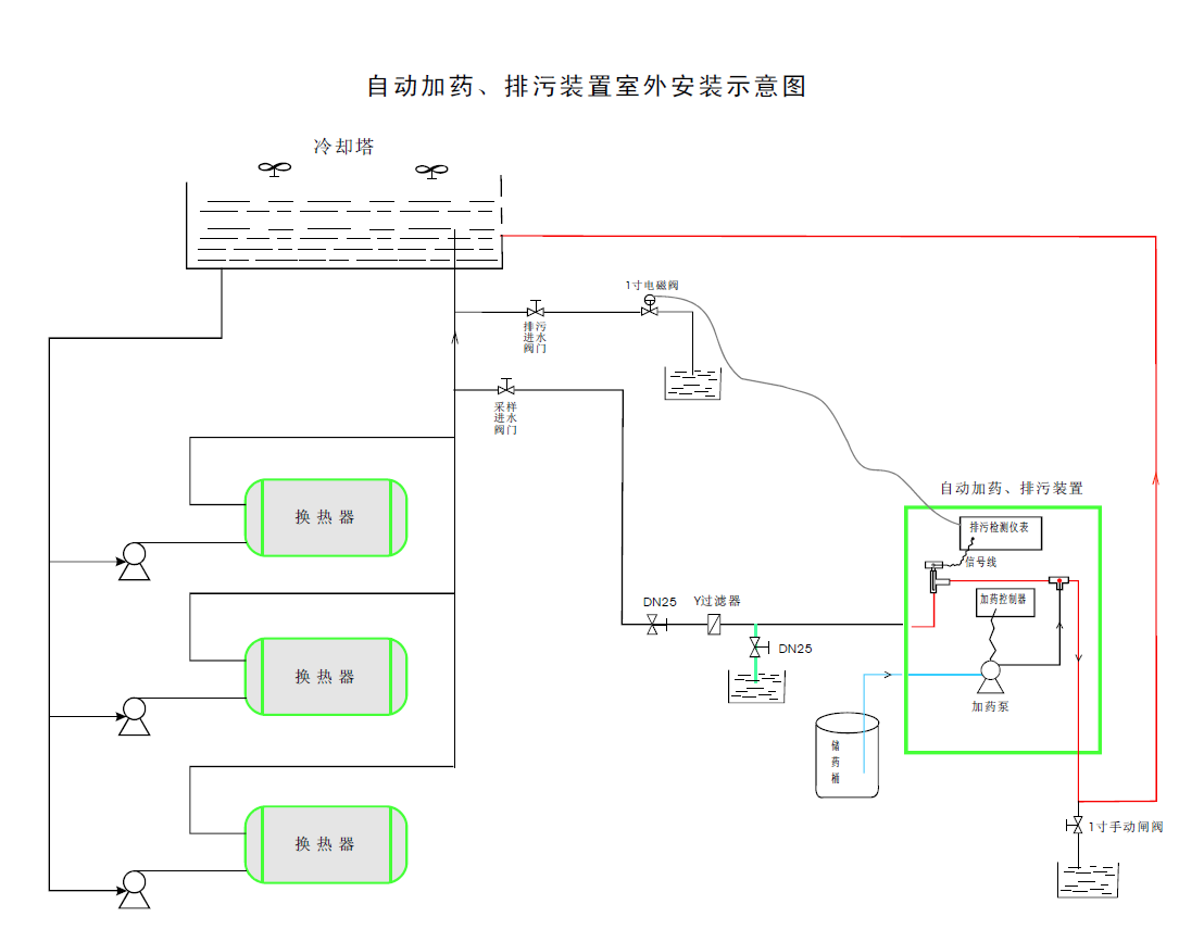 也可以配備pH/ORP探頭,用以實(shí)時(shí)監(jiān)測循環(huán)水的氧化還原電位,根據(jù)ORP的數(shù)值控制加藥泵自動(dòng)往循環(huán)水系統(tǒng)中投加氧化性殺菌劑,從而達(dá)到不間斷控制系統(tǒng)菌藻滋生的問題。
